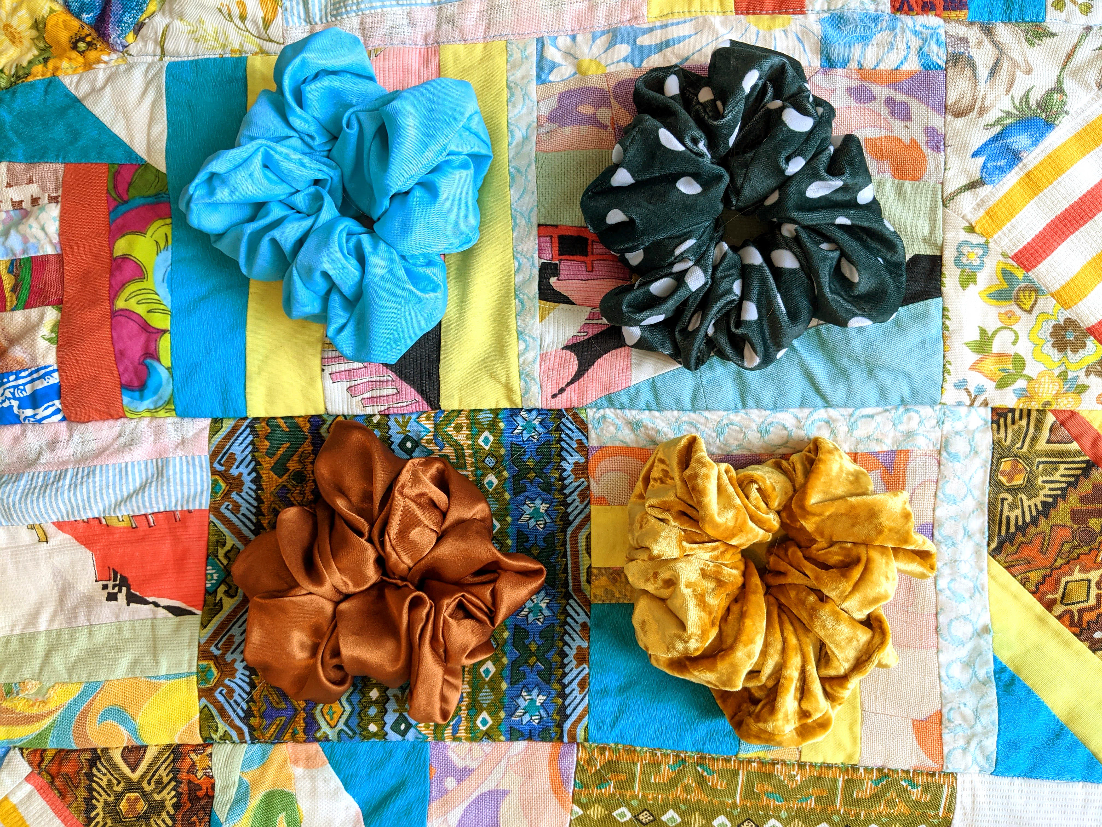 A selection of silky scrunchies on my wrist, which are specifically wide for longer or thick hair (and so won't smush my wrists,