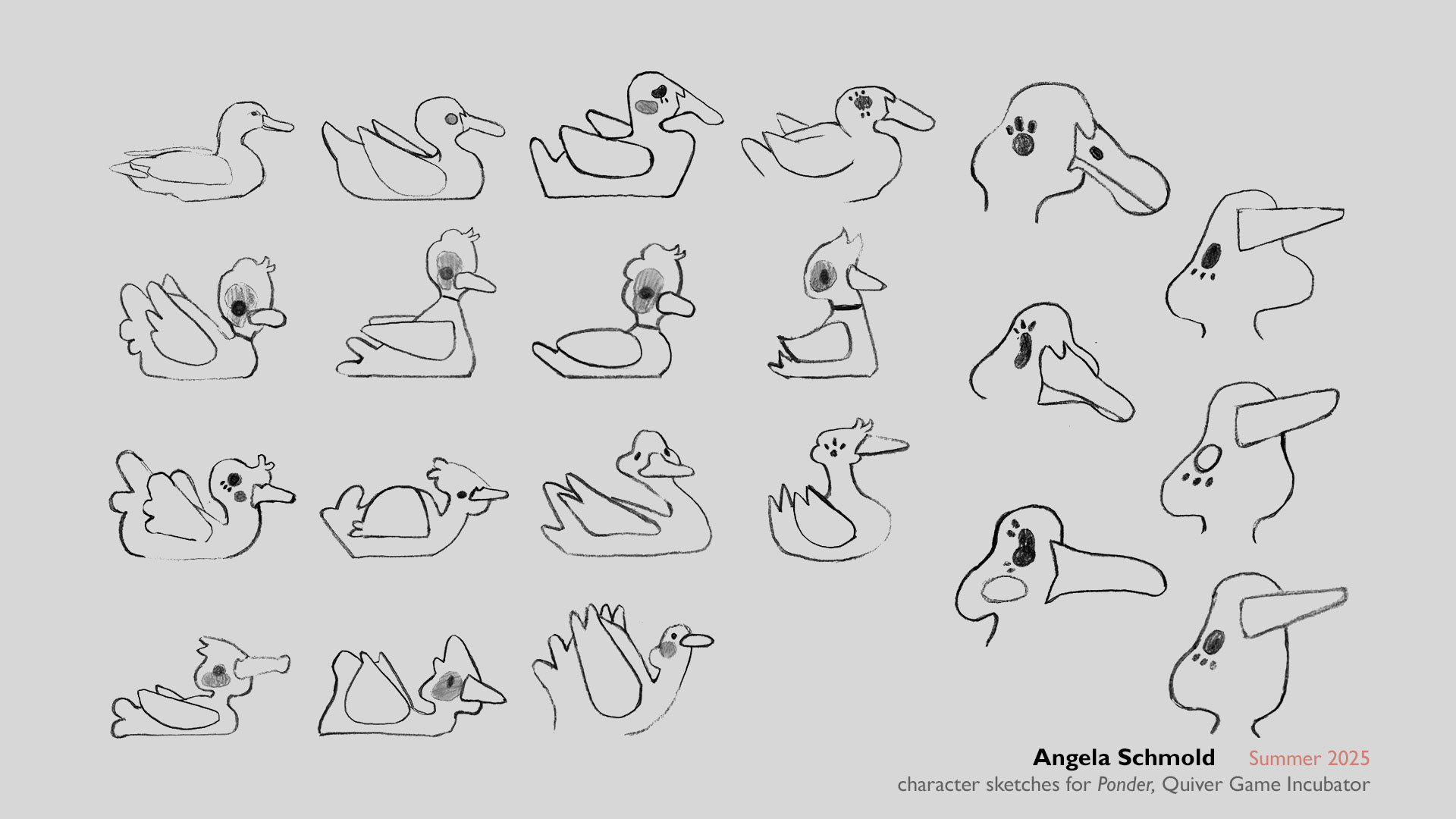 I laid out moodboards to pitch different illustration styles for the game, based on the concept of a lonely duck after a storm. We went with "2 patchwork", which leaned into simple shapes overlaid with textures and patterns, often featured in paper cut illustrations. I applied the simple shapes to the character designs, which were later overlaid with texture I produced with acrylic paint.