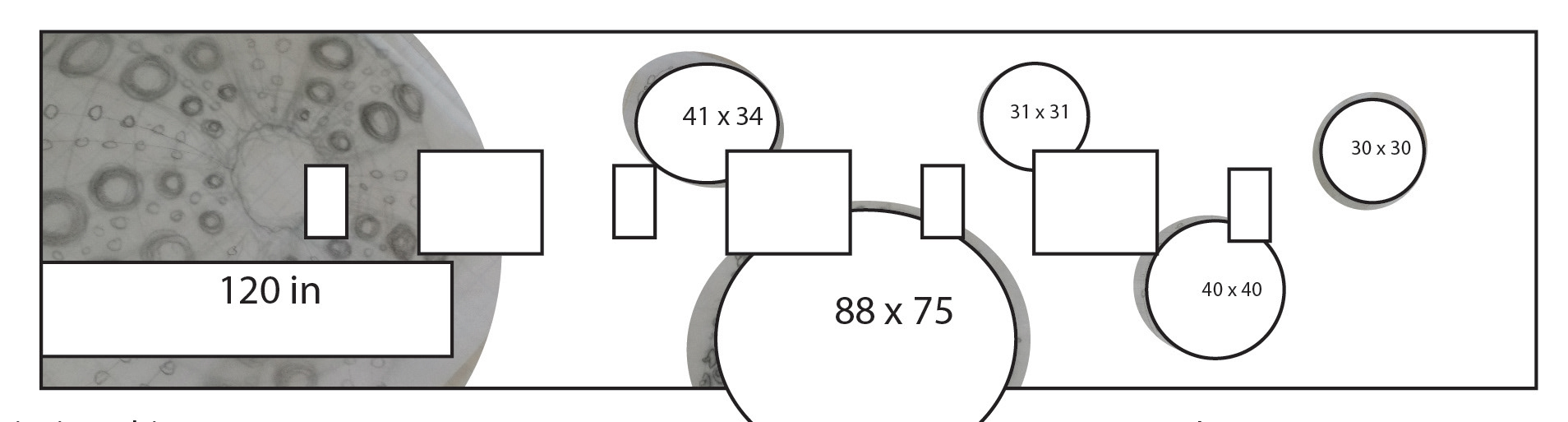 Some of the layout variations of the mural, taking into account the shelves and lighting that would block the images, in a vauge proportion to the actual wall.