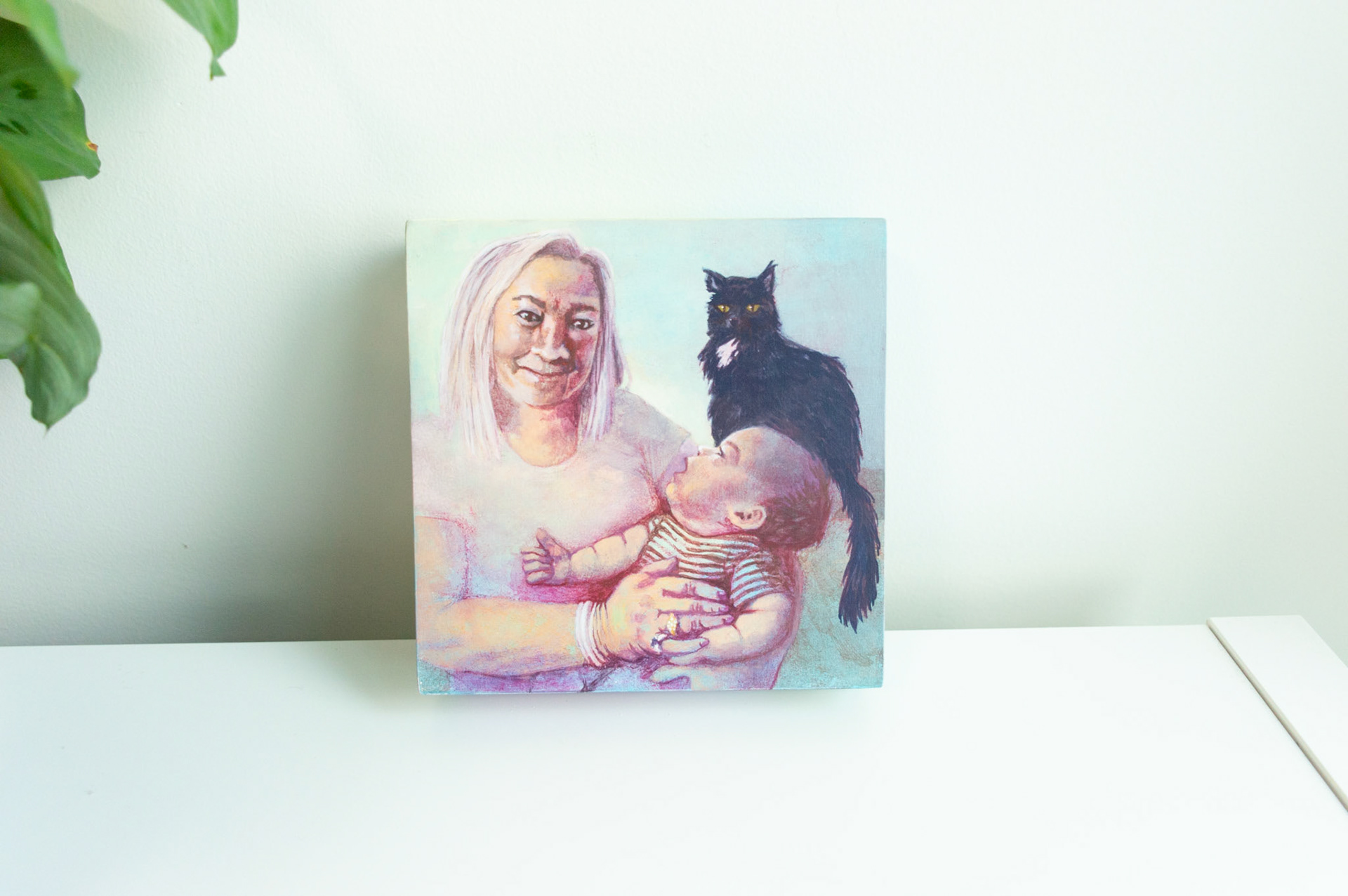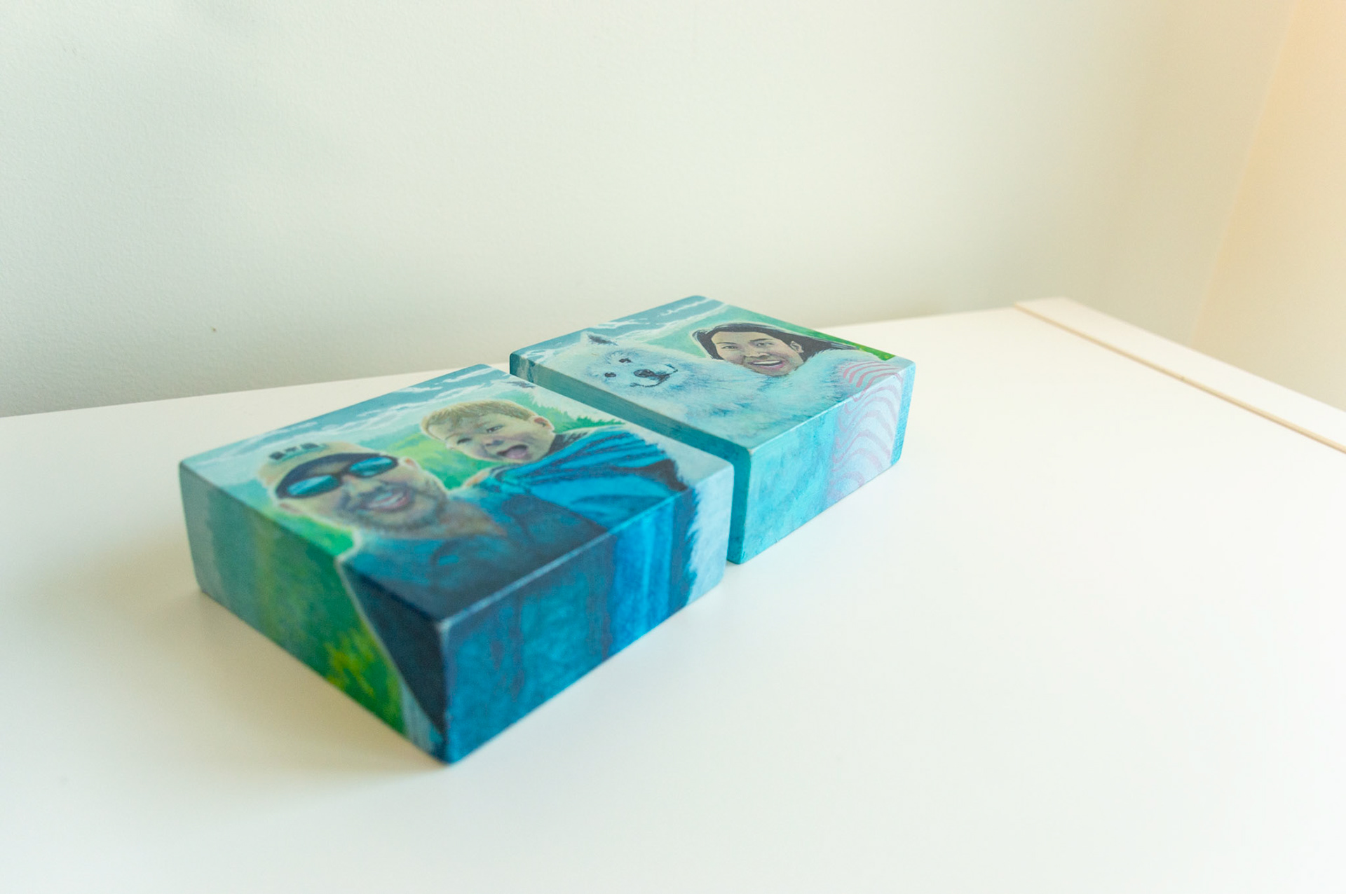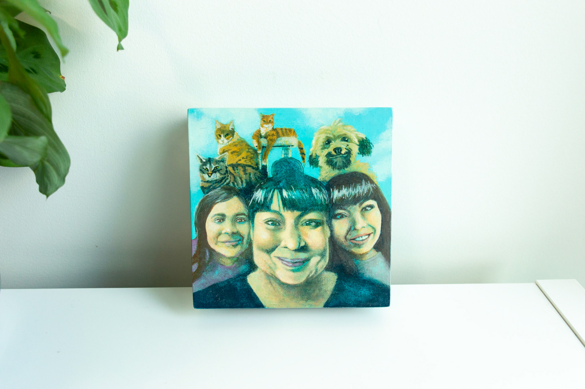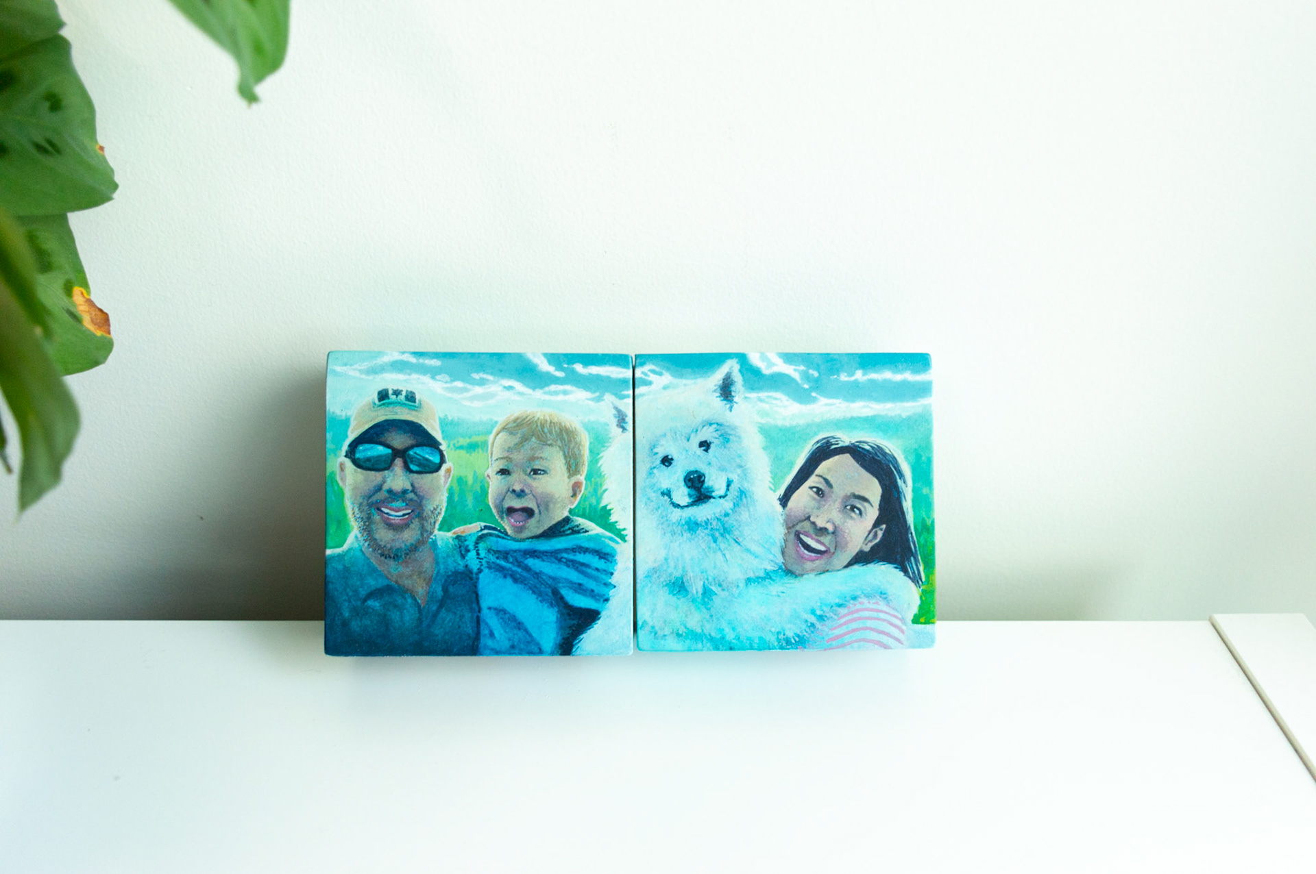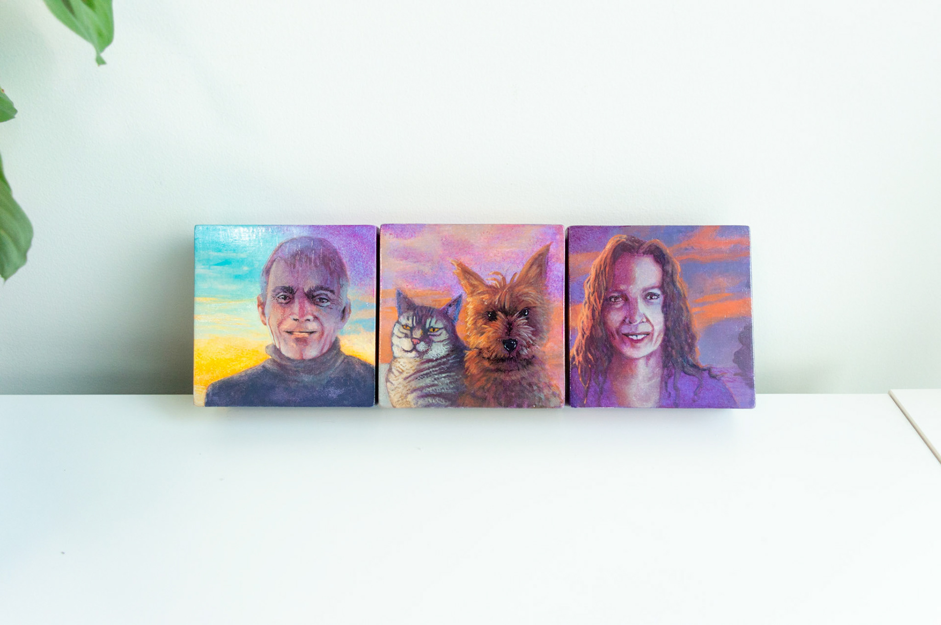 Portraits of people and pups in either acrylic or watercolour. Many done from life, while others are combinations of photos and specified colour schemes.